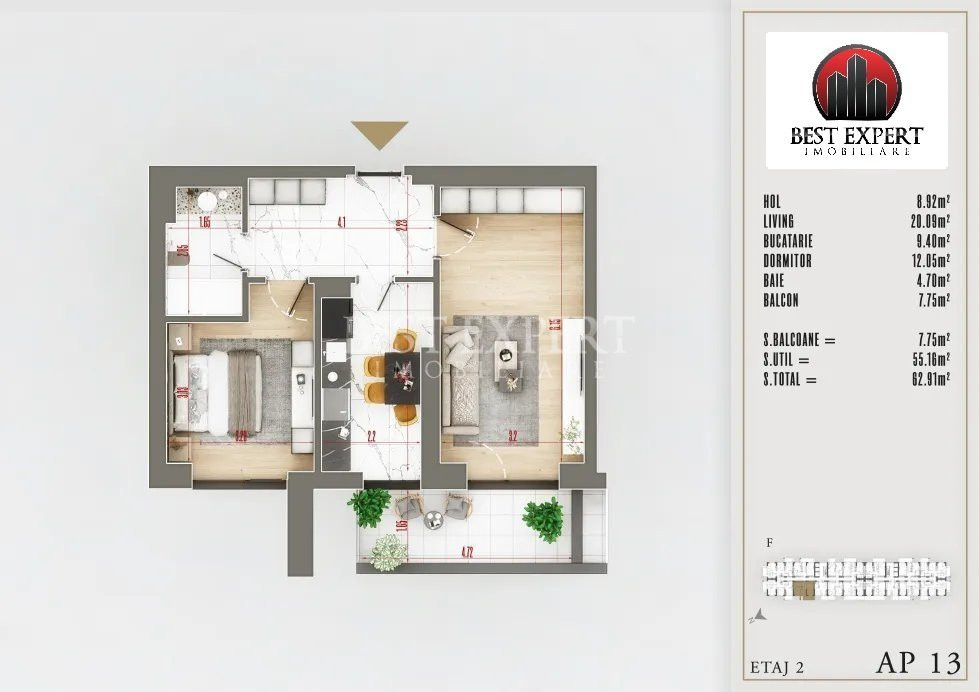 Suprafata utila – 55.16 mp utili +7.75 mp balcon, total 62.91 mp utili