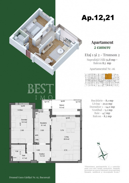 Suprafata utila - 52.80 mp utili +balcon 8.50 mp, total 61.30 mp utili