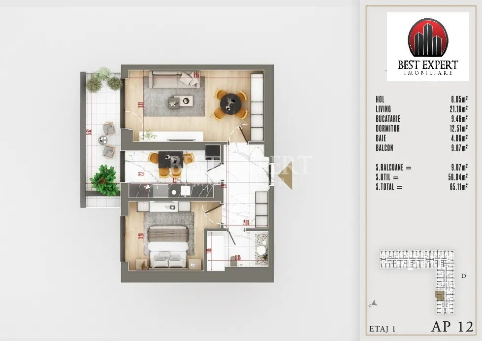 Suprafata utila – 56.04 mp utili +9.07 mp balcon, total 65.11 mp utili