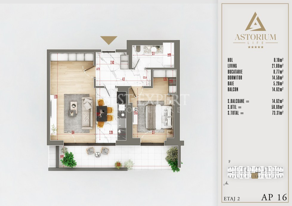 Suprafata utila – 58.69 mp utili +14.62 mp balcon, total 73.31 mp utili