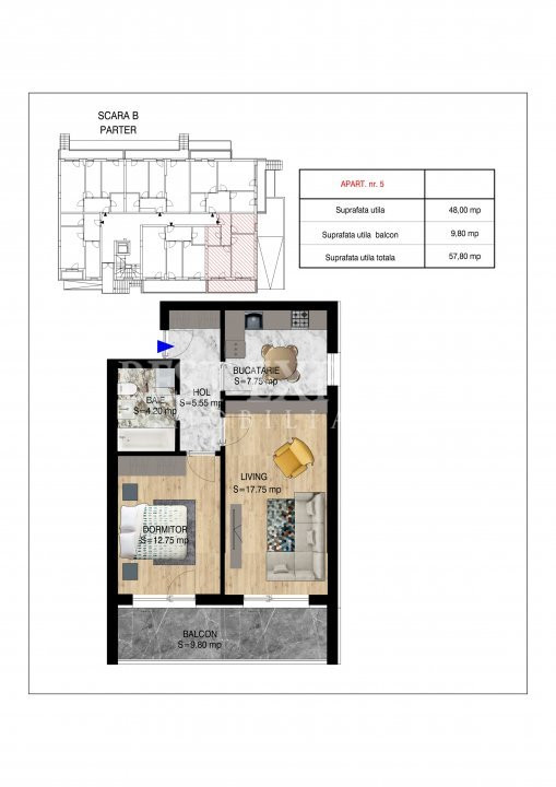 Suprafata utila -48.00 mp utili +.9.80 mp balcon, Suprafata totala utila 57.80 mp