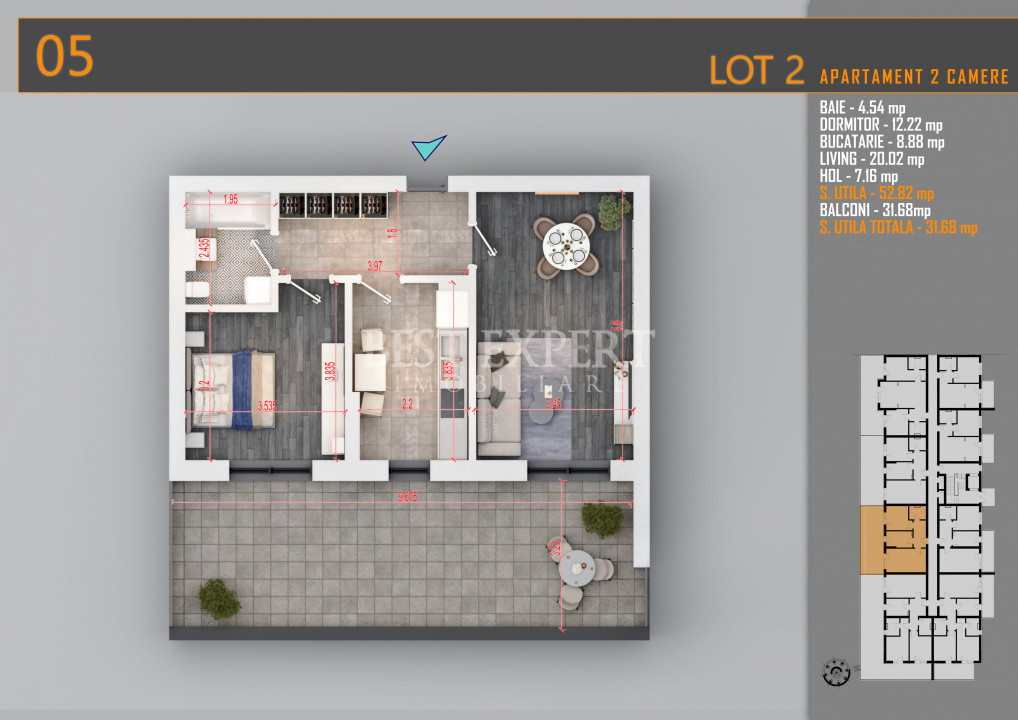 Suprafata utila - 52.82 mp utili +33.24 mp balcon, total 86.06 mp utili