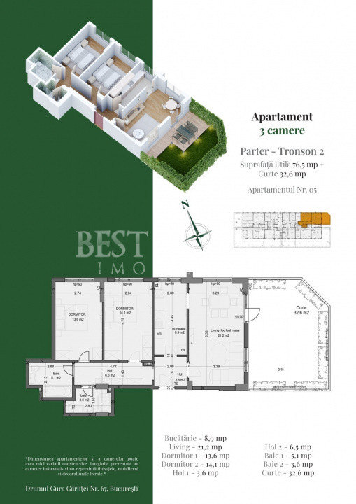 Suprafata utila - 76.50 mp utili +curte 32.60 mp, total 109.1 mp utili