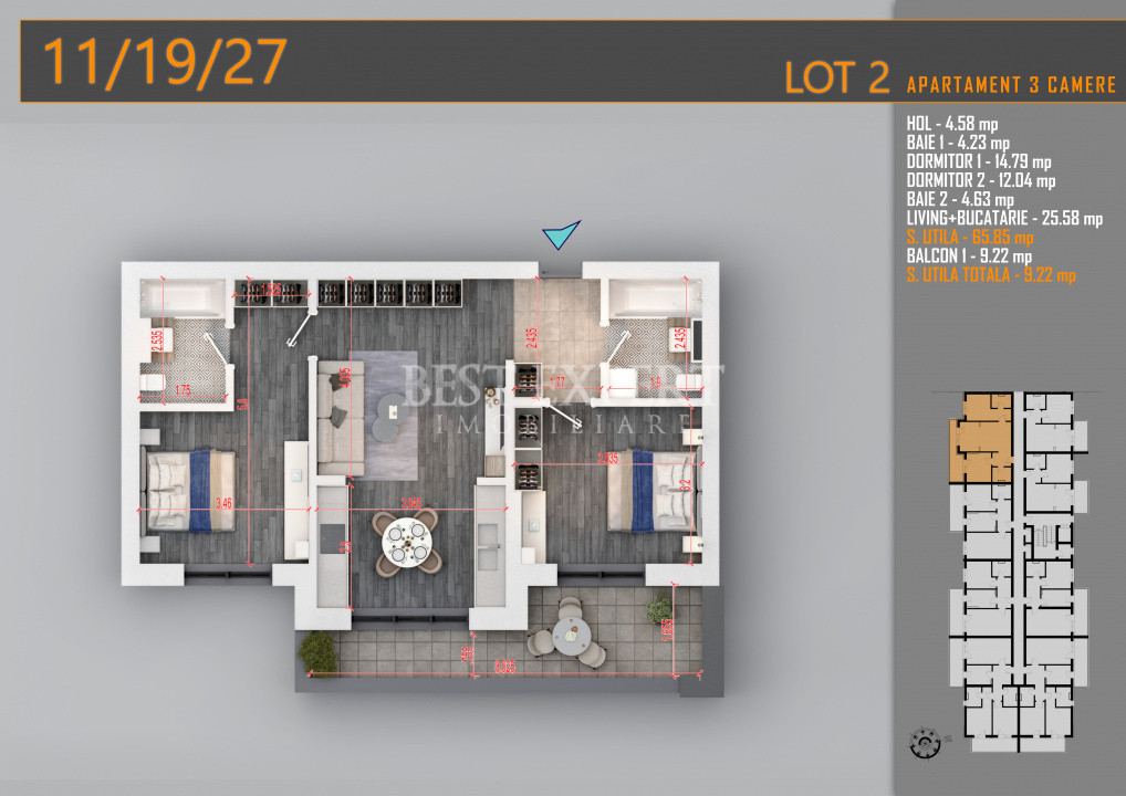 Suprafata utila - 65.84 mp utili +10.01 mp balcon, total 75.85 mp utili