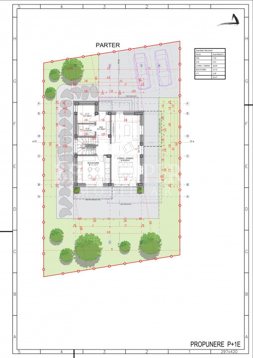 La parter se regăsesc camera tehnică, living cu zonă de dining, bucătăria și grupul sanitar, însumând aproximativ 54 mp utili.